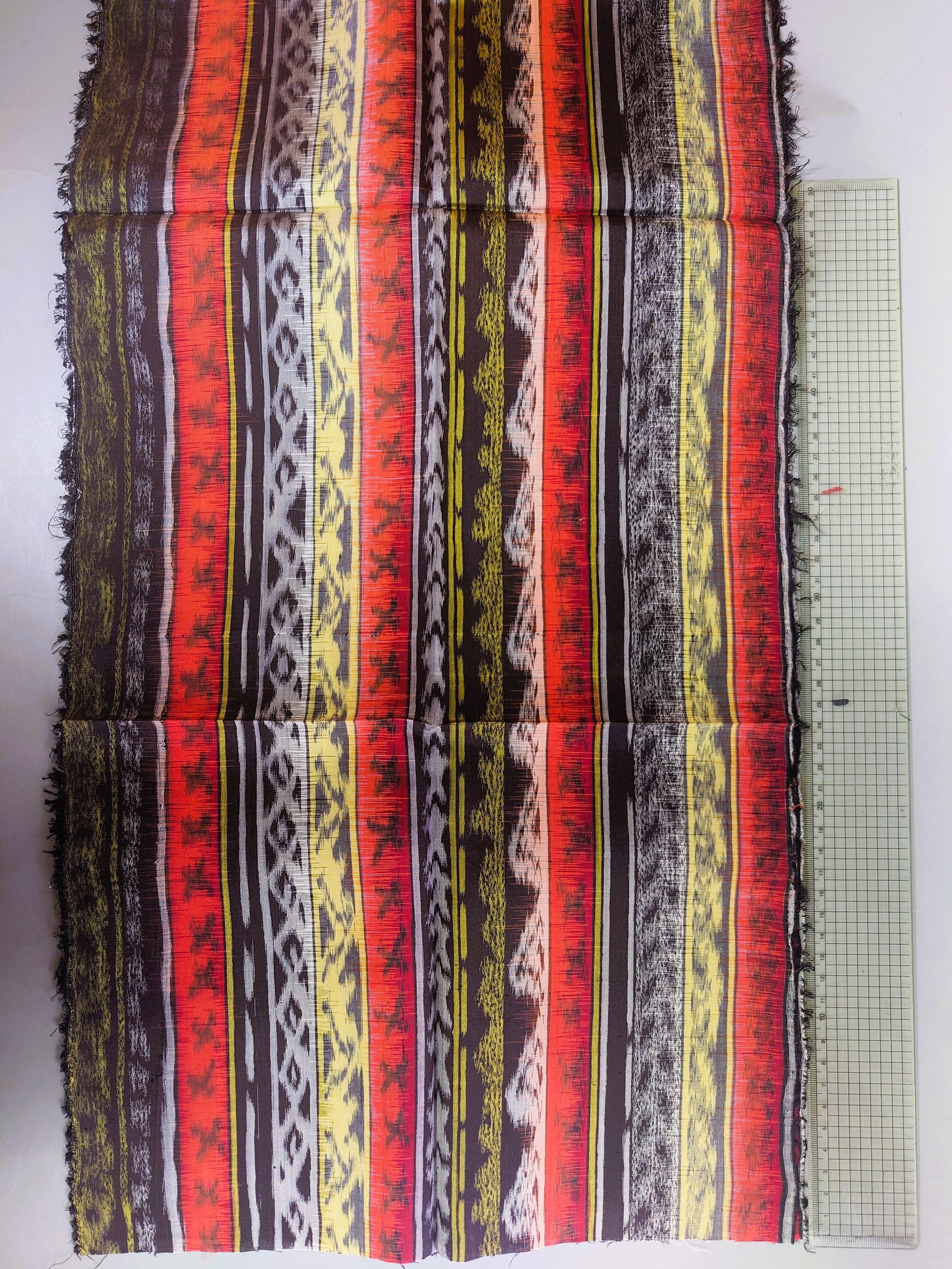 【古布】再販 銘仙 黒・赤・黄・白の変わり縞柄 大巾