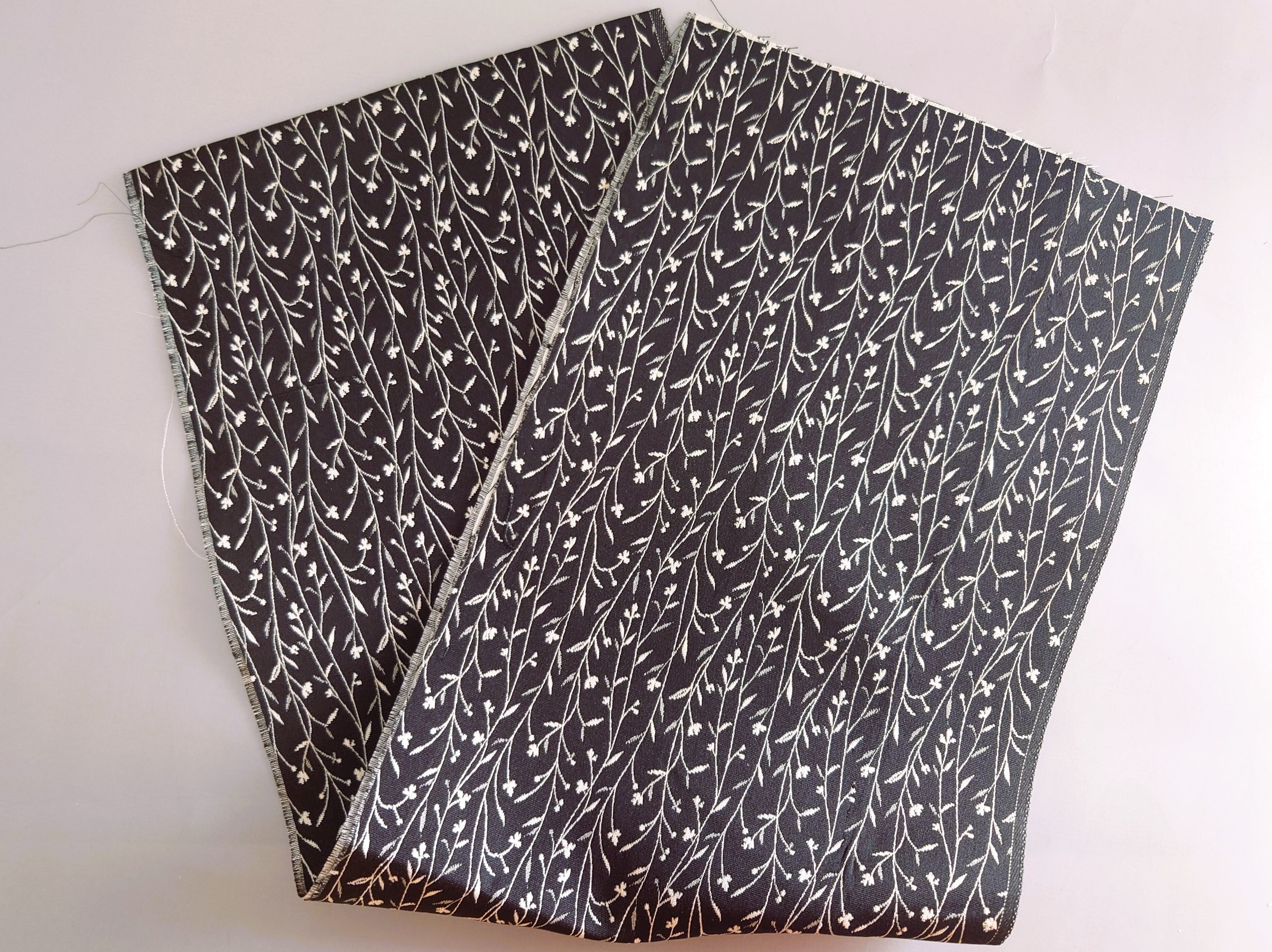 黒地に白抜きの植物の茎の細縞柄の生地です。