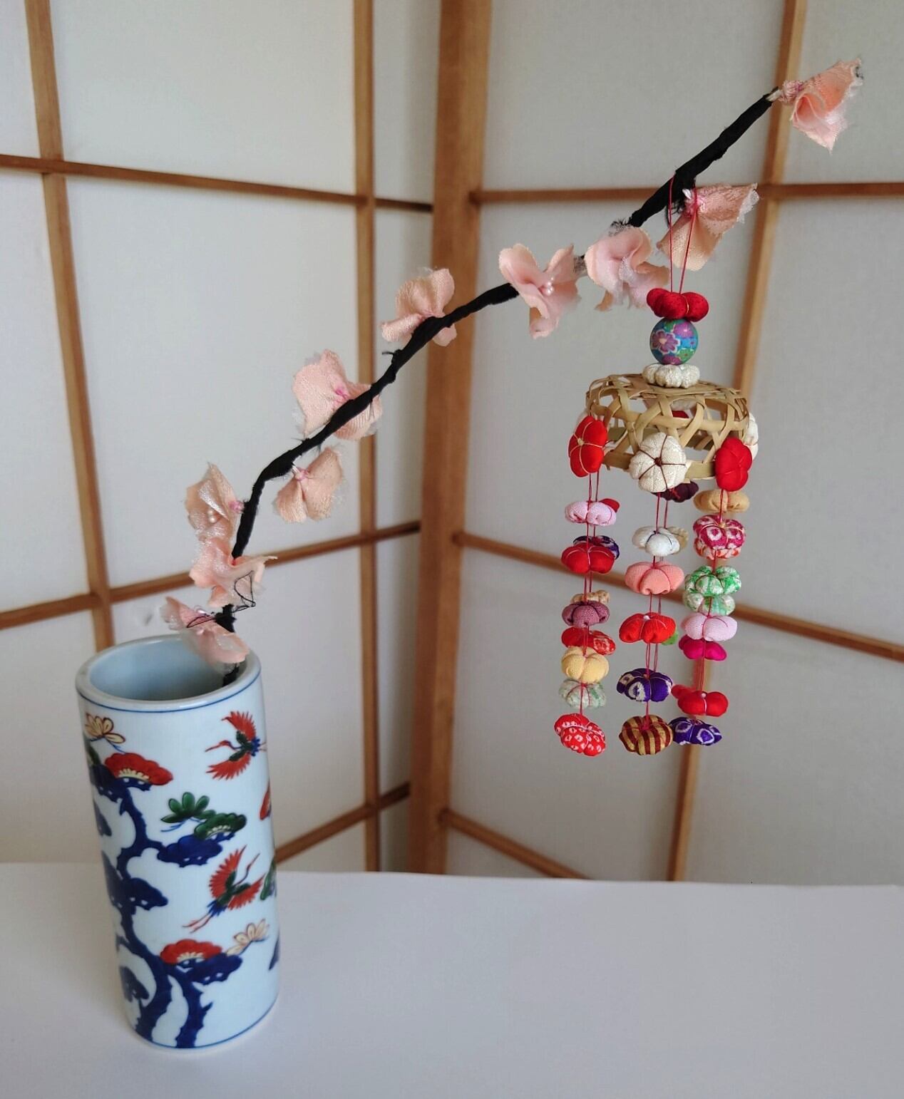 桃の花に吊るしびなの作品です。