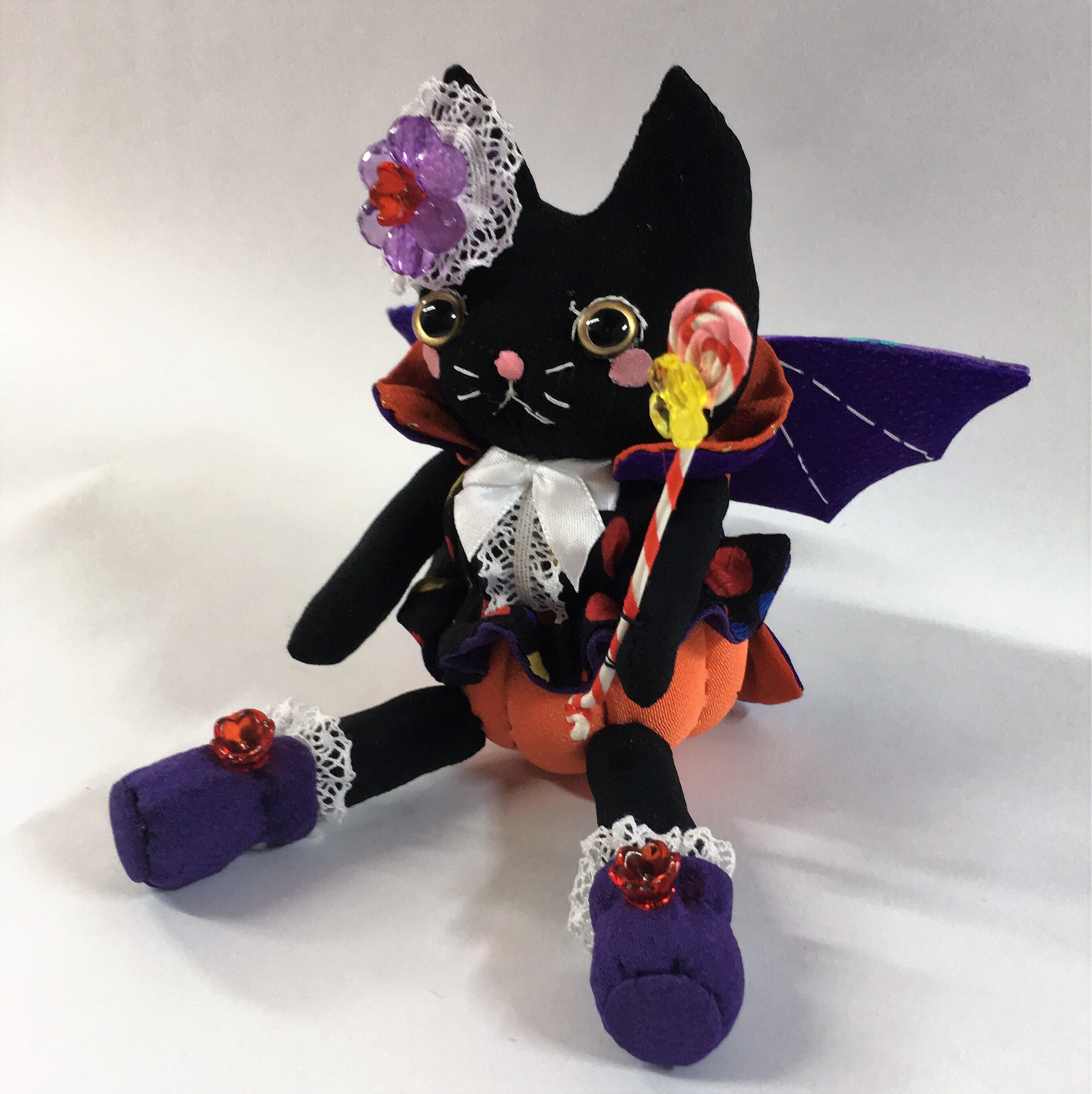 ぺろぺろキャンディーの魔法の杖と蝙蝠の羽を付けた扮装をしています。